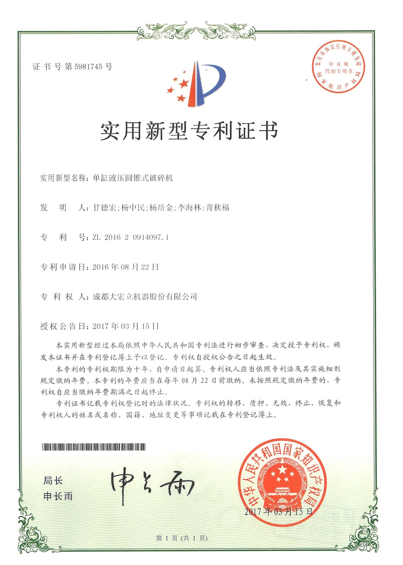 目前,PYY系列單缸液壓圓錐式破碎機已取得超30項專利技術(shù),其中,PYYZ800經(jīng)成都融智創(chuàng)新科技評估中心認證為國內(nèi)領(lǐng)先產(chǎn)品。